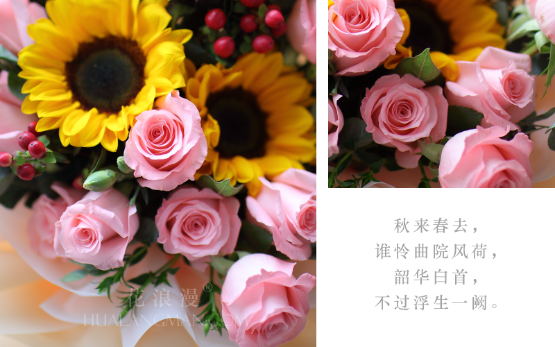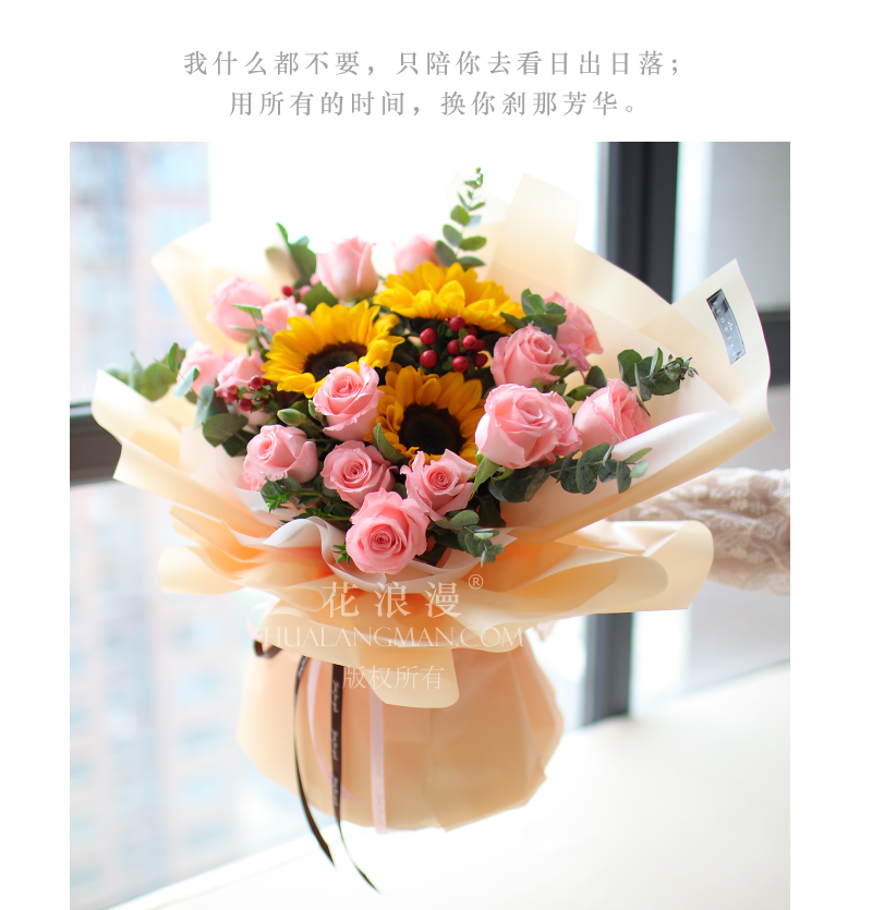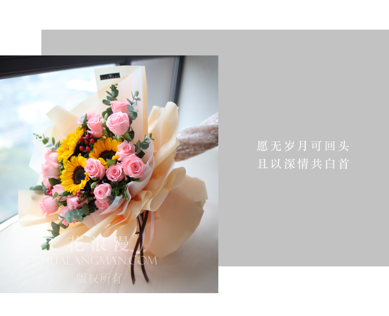 - 19枝戴安娜玫瑰,3枝向日葵,红豆,尤加利;包装如图