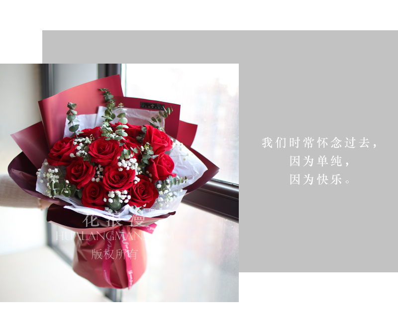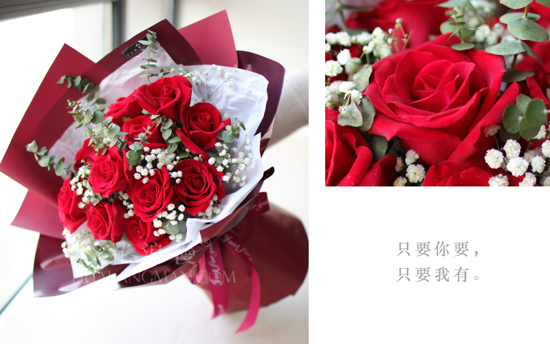 - 11枝红玫瑰,满天星、尤加利点缀;包装如图