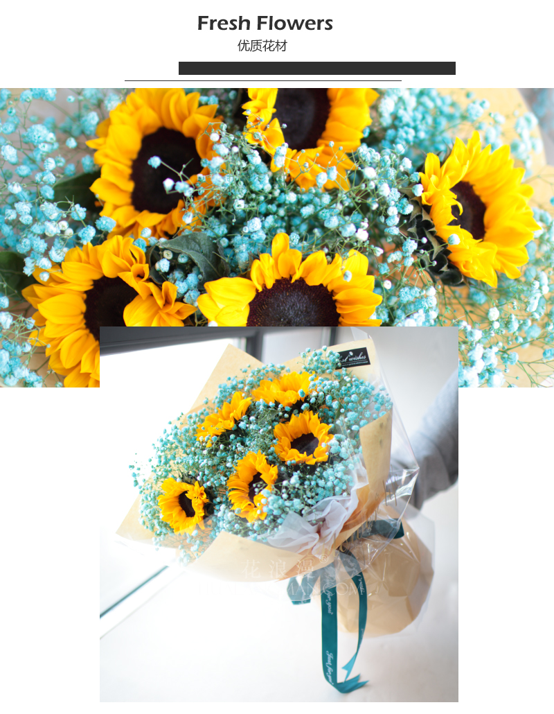 5朵向日葵,蓝色满天星;牛皮纸,OPP膜,丝带