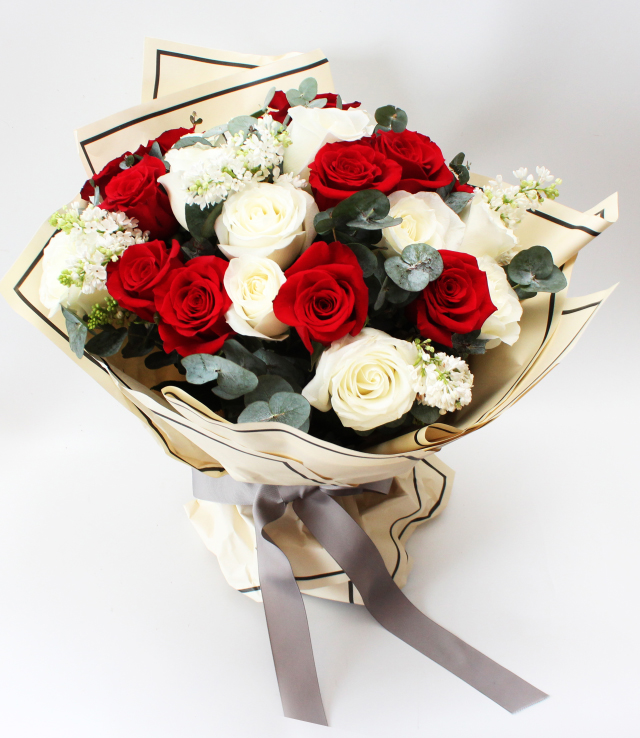 - 11枝红玫瑰,11枝白玫瑰,尤加利,满天星;包装纸可能与图片不完全一样,用近似的替代