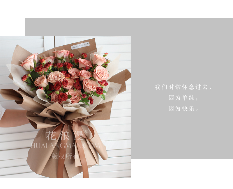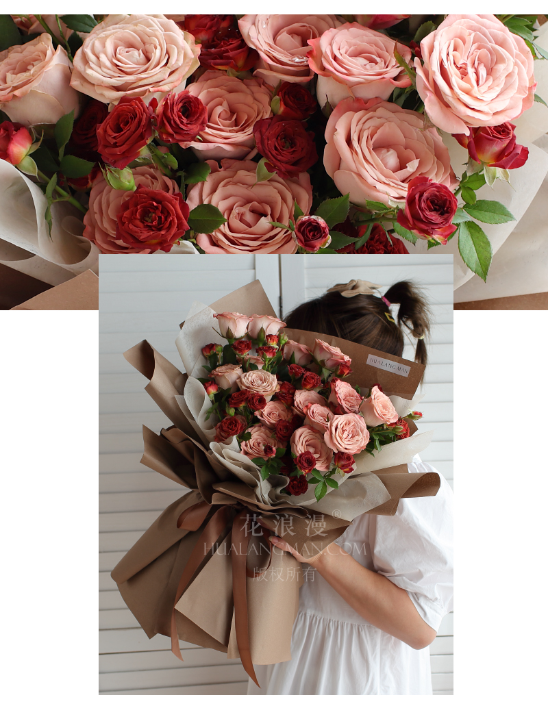 - 卡布奇诺玫瑰19支(注意:卡布奇诺玫瑰品种特别,此品种花瓣看上去旧旧的无光泽,实物可能会有不同色差,且颜色暗沉,不喜勿订),多头泡泡10支;内衬奶白色棉纸,咖色包装纸,丝带