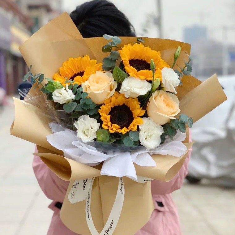 - 3朵向日葵,2朵香槟玫瑰,白色或绿色桔梗(至少5朵开放),尤加利;如图包装