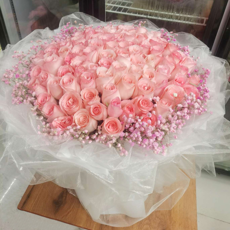 - 99朵戴安娜玫瑰(粉玫瑰),粉色满天星外围;如图白色包装,白纱