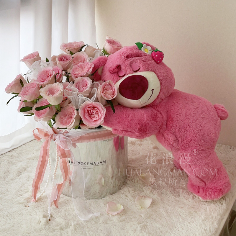 - 52枝洛神玫瑰,草莓熊(本款商品需与在线客服确认有货再下单);如图抱抱桶