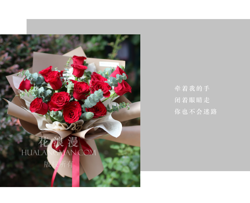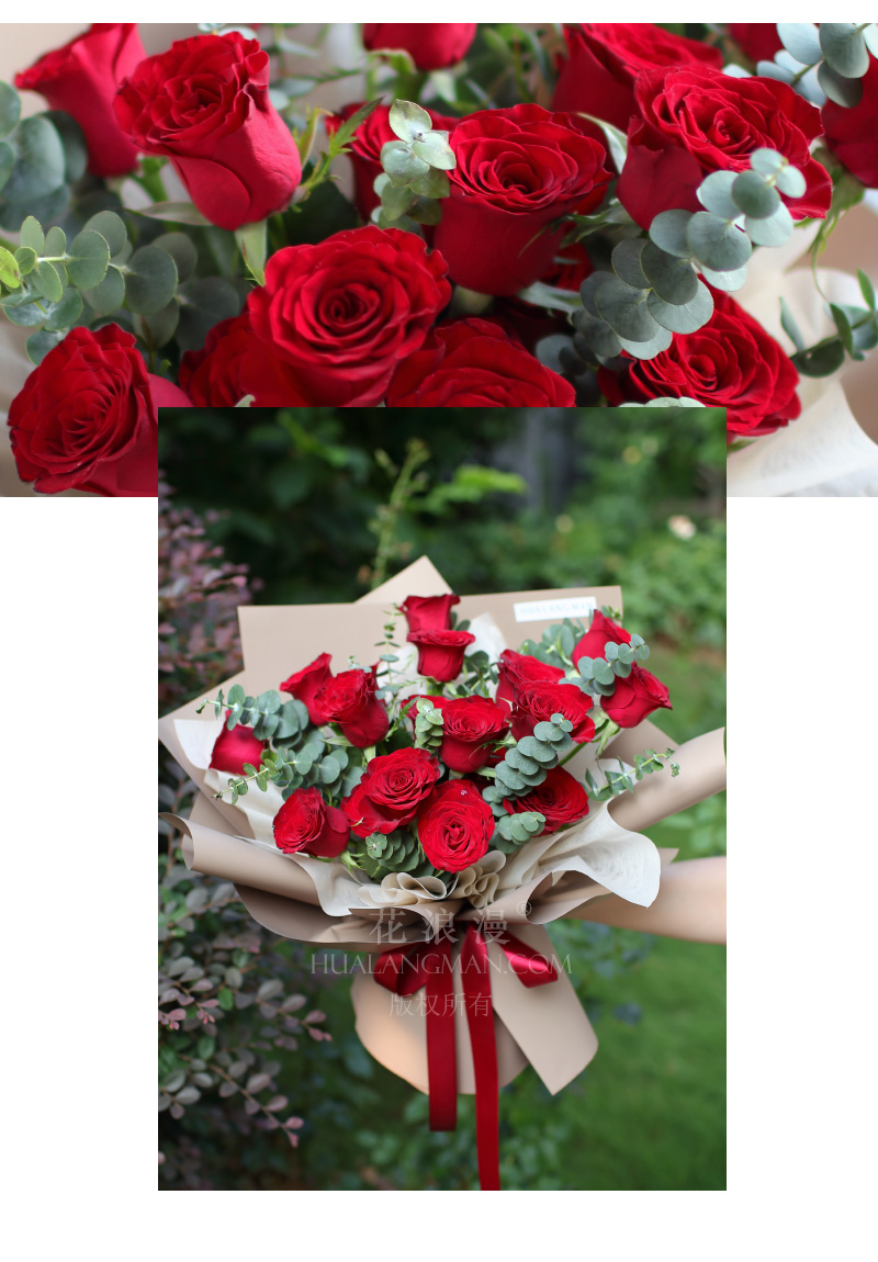 - 19枝红玫瑰,尤加利点缀;如图包装