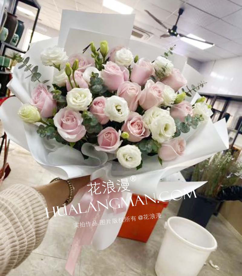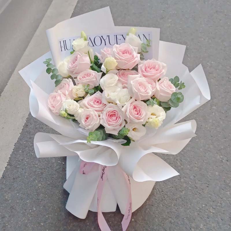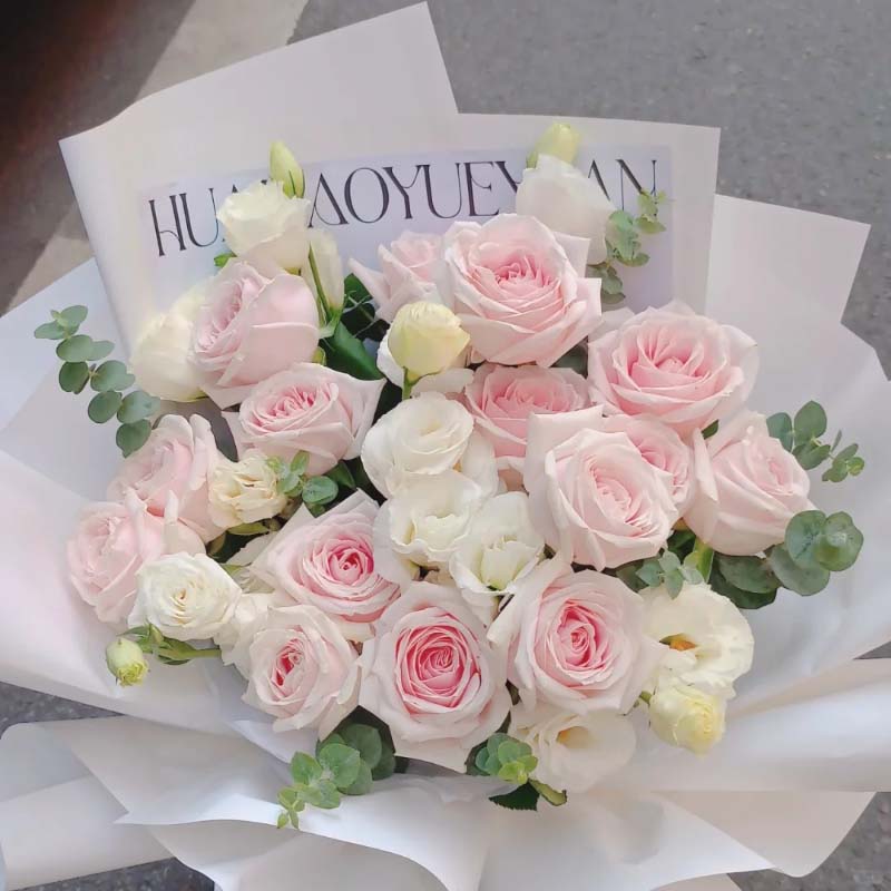 - 15枝粉雪山玫瑰(或戴安娜玫瑰),桔梗,尤加利;如图包装