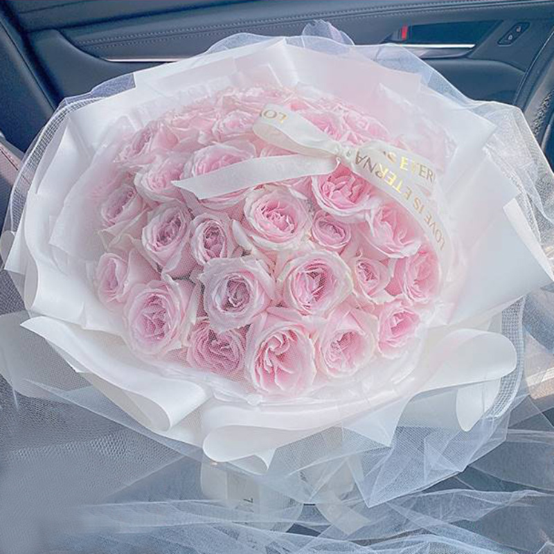 - 33枝粉雪山玫瑰(若遇粉雪山品种缺货则使用粉色戴安娜玫瑰替代);如图白色纱覆盖花朵,白色包装