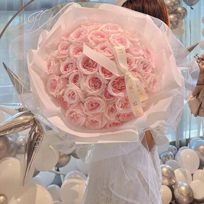 - 33枝粉玫瑰(粉荔枝或粉雪山玫瑰或洛神玫瑰);如图白色纱覆盖花朵,白色包装