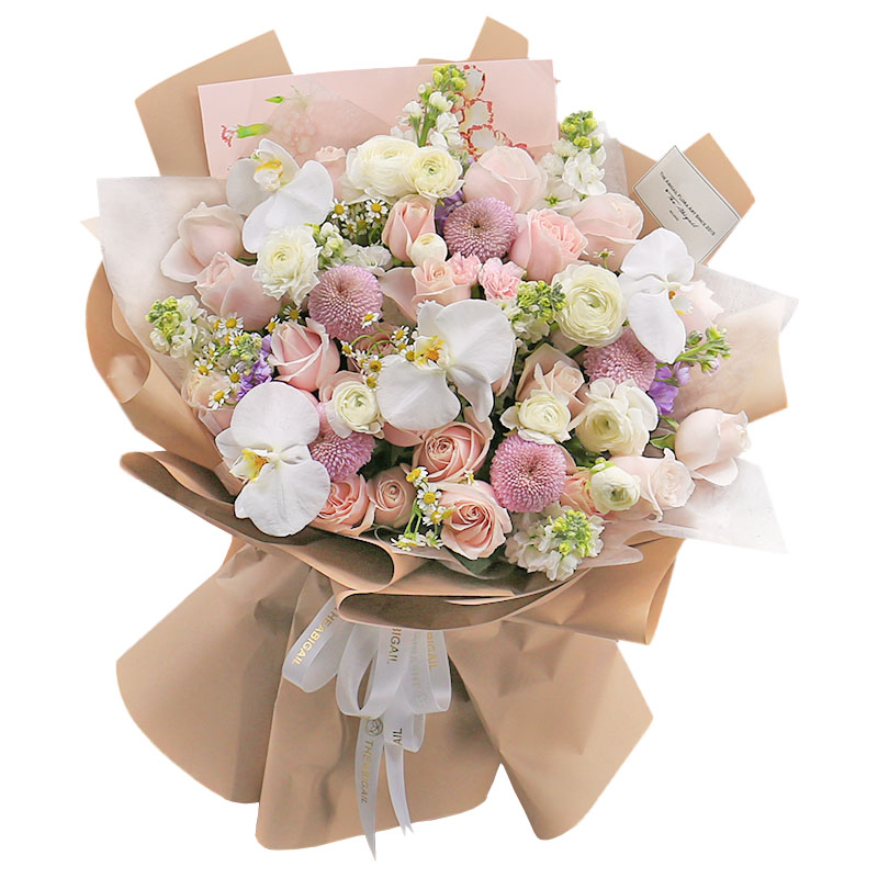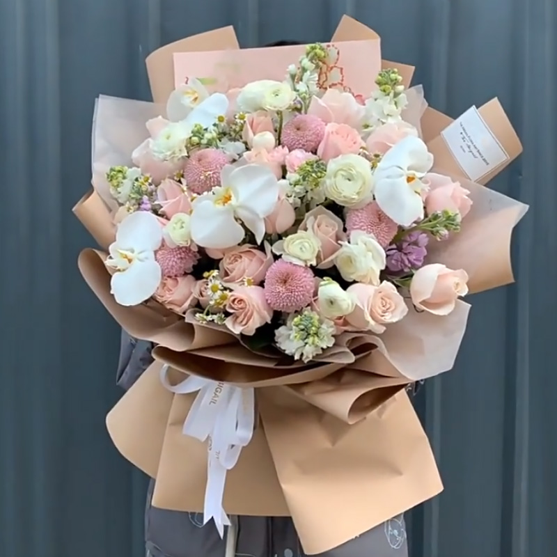 - 粉雪山19枝,粉色乒乓菊5枝,白色紫罗兰5枝,白色洋牡丹6枝,白色蝴蝶兰4枝,洋甘菊(此商品含特殊花材,需提前2天预定,或下单前先与在线客服确认最快送达时间);如图包装