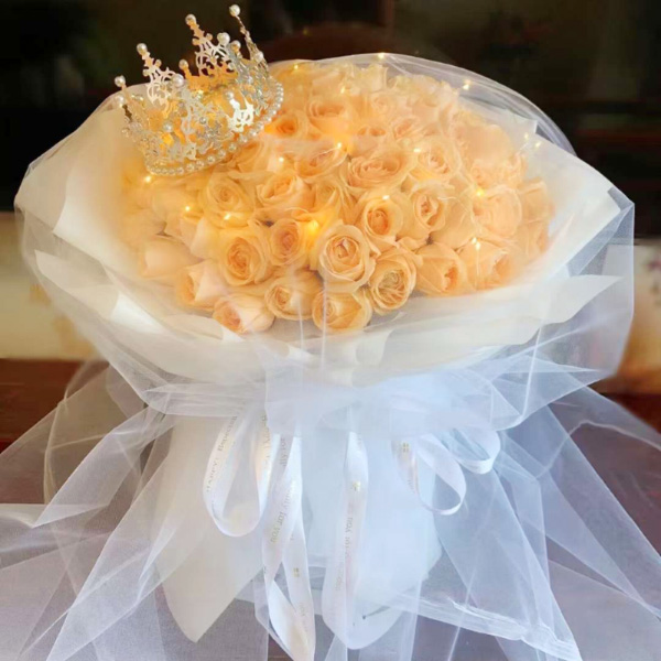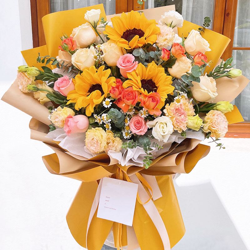 - 12枝香槟玫瑰,6枝戴安娜玫瑰,3枝向日葵,7-10朵橙色泡泡,5枝香槟色桔梗,3枝白色桔梗,洋甘菊,尤加利;如图包装