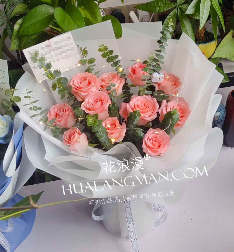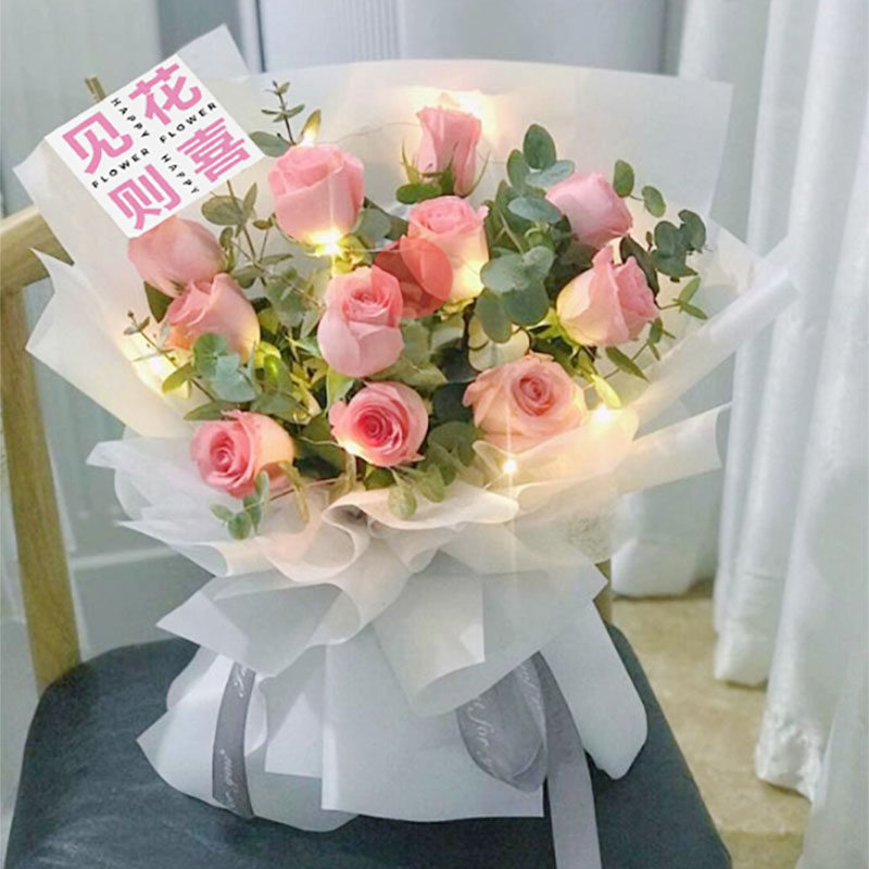 - 11枝戴安娜玫瑰,尤加利,发光灯串;如图白色包装