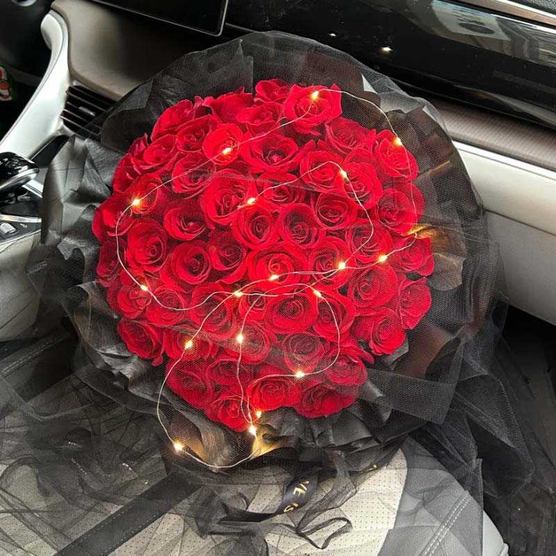 66朵红玫瑰,发光灯串;黑色包装,黑纱