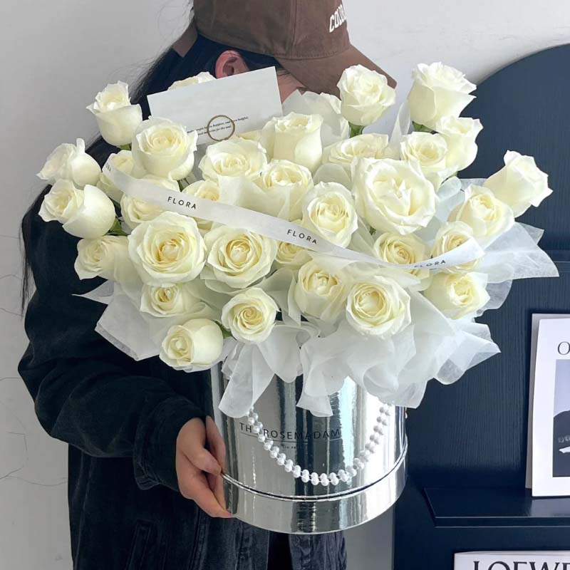 - 33枝白玫瑰,抱抱桶;抱抱桶包装