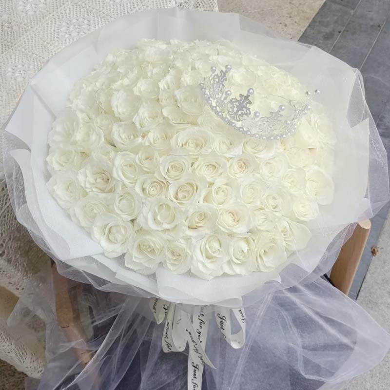 - 99枝白玫瑰,皇冠;如图白色纱覆盖花朵,白色包装