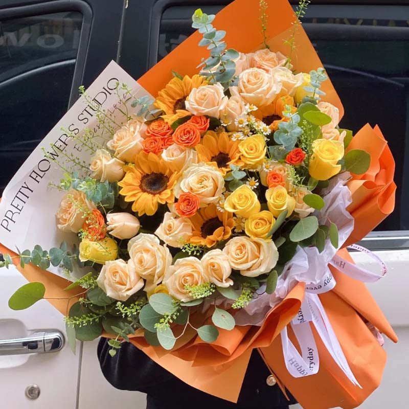 - 19枝香槟玫瑰,5支向日葵,6支黄玫瑰,3枝多头泡泡(橙芭比),洋甘菊,尤加利;英文纸,橙色包装纸如图包装