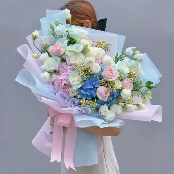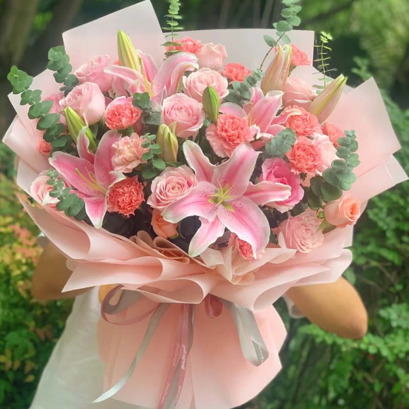 - 11枝粉玫瑰,11枝粉色康乃馨,4枝多头粉百合,尤加利;如图包装