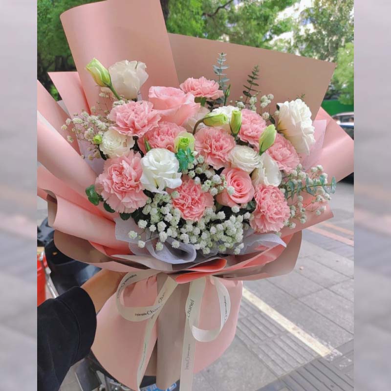 - 9朵粉色康乃馨,2朵粉玫瑰,3枝多头桔梗(至少9朵开放),尤加利,满天星;如图包装