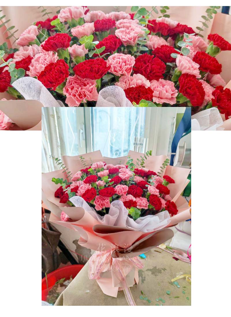 - 共52朵康乃馨,其中红色康乃馨26朵,粉色康乃馨26朵,尤加利;如图包装