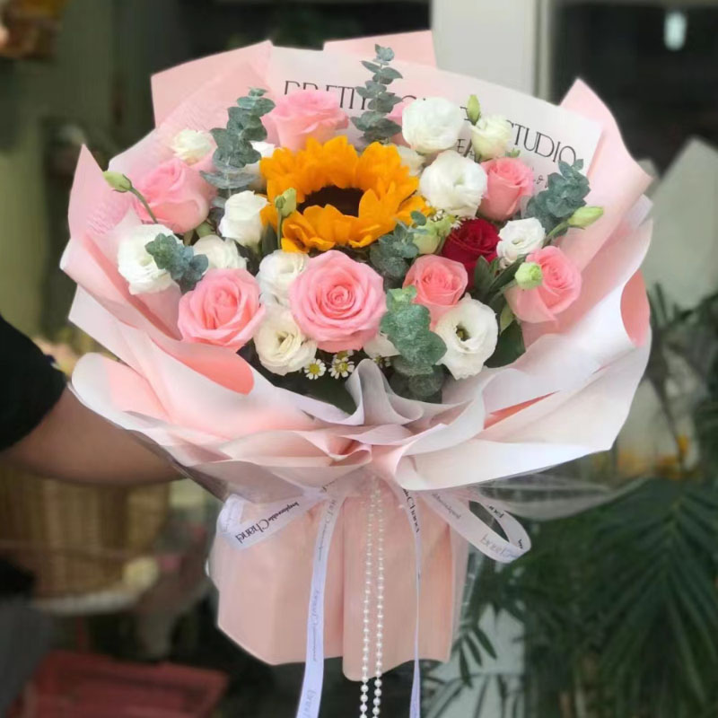 9枝粉玫瑰,1枝向日葵,9-11朵左右的桔梗,1枝红玫瑰,尤加利,洋甘菊;如图包装