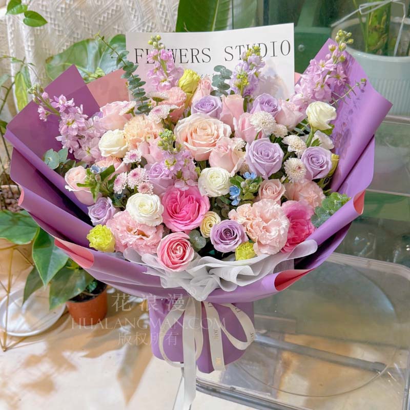 5枝紫罗兰,7枝紫玫瑰,11枝粉雪山玫瑰,3枝粉色康乃馨,多头白桔梗,尤加利,小雏菊;如图紫色包装