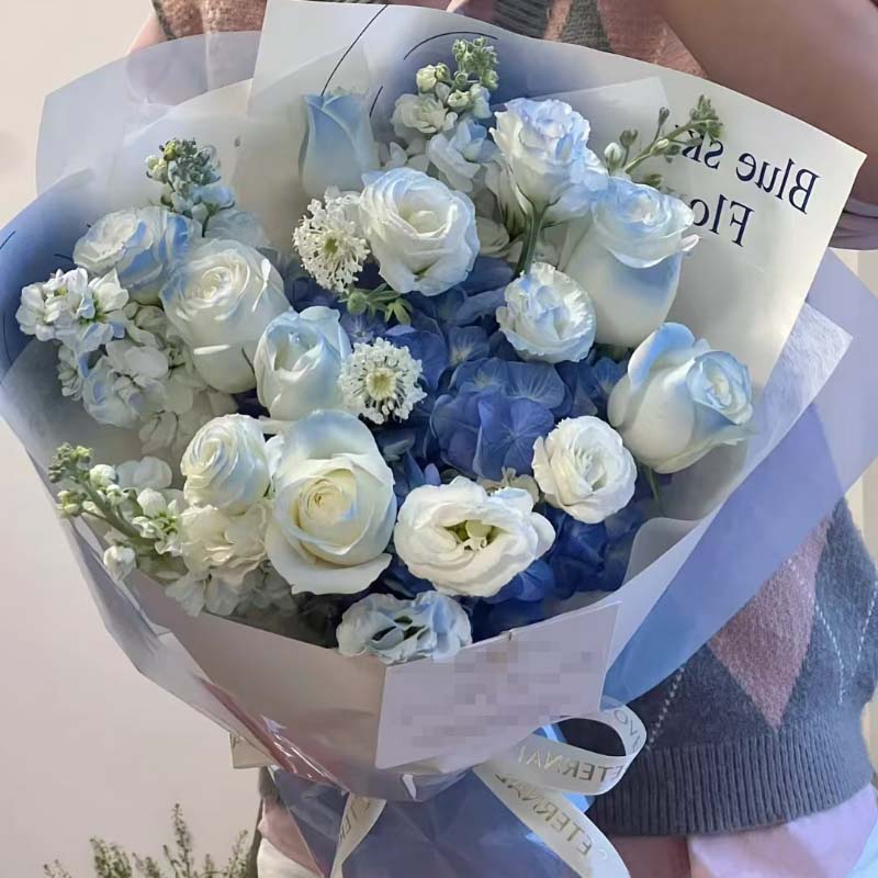 - 7枝白玫瑰(喷染蓝色),7朵白桔梗(喷染蓝色),1枝蓝绣球,5枝紫罗兰,白色配花;如图包装