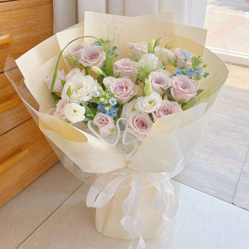 - 13朵曼塔玫瑰,桔梗花,配草;如图包装