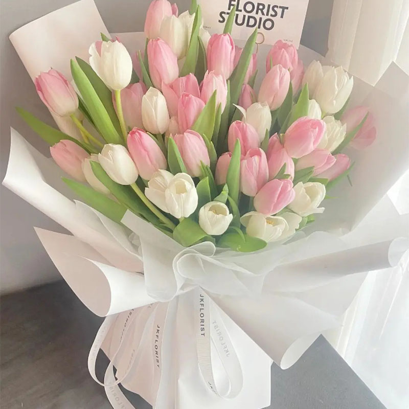本款花语:粉色郁金香象征永恒幸福,白色郁金香寓意纯洁恋情。