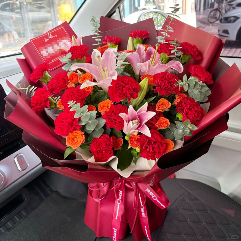 - 19朵红色康乃馨,3朵粉百合,3枝多头橙色泡泡,尤加利;如图包装