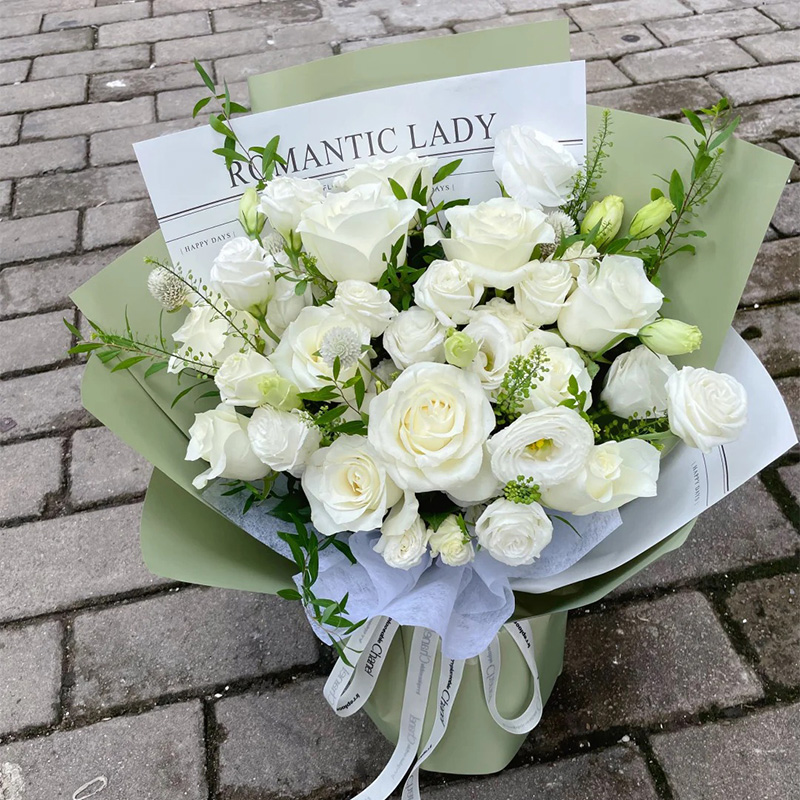 11枝白玫瑰,多头桔梗,绿色配叶;如图包装