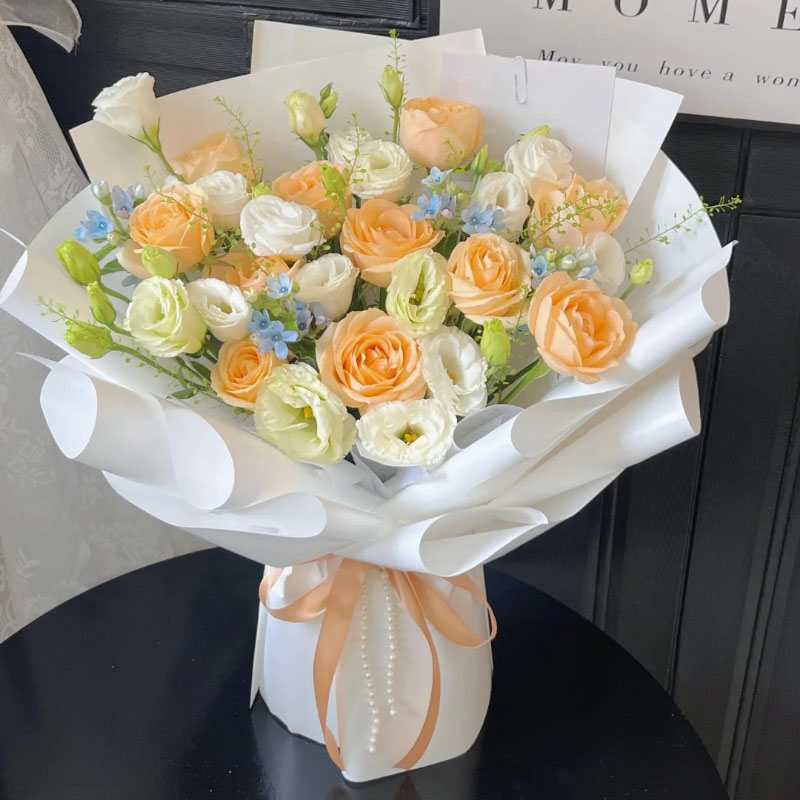 - 11枝香槟玫瑰,多头桔梗,配花,配草;如图包装