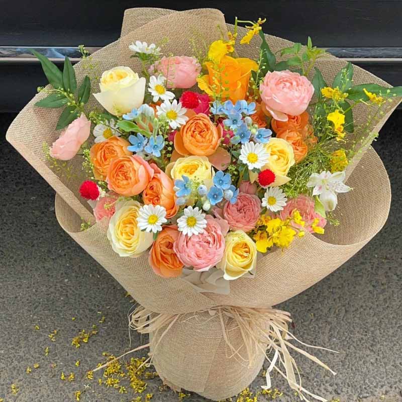 - 奶油杯玫瑰,粉玫瑰,橙色花朵,迷你菊,小红花,跳舞兰,蓝星花,九星叶,绿铃草(此花束包含特殊花材,至少提前3天预定,需联系在线客服确认有货才下单);如图包装