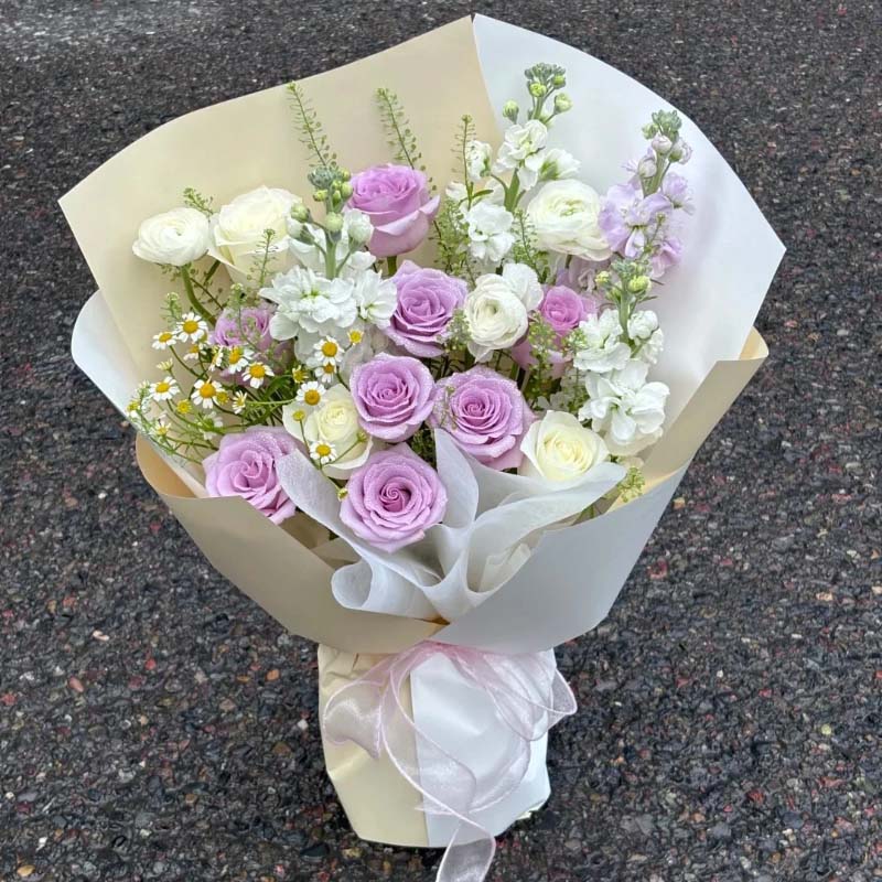 - 8枝紫玫瑰,6枝白玫瑰,3枝白色紫罗兰,1枝紫色紫罗兰,配花;如图包装