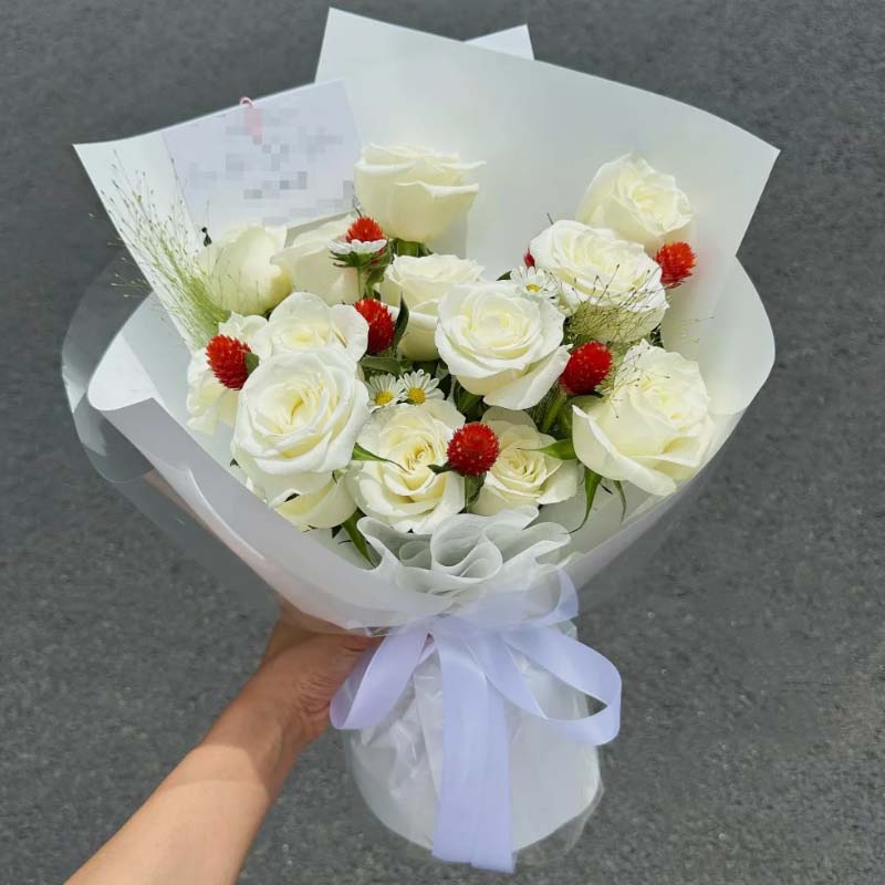 13枝白玫瑰,千日红,配花,配草;如图包装