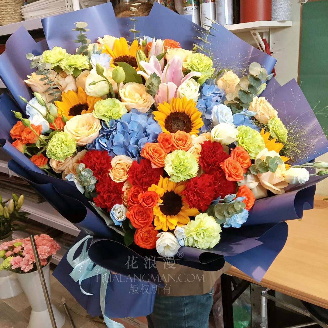 5枝向日葵,2枝蓝绣球,19枝香槟玫瑰,3枝多头绿桔梗,橙色多头泡泡,6枝多头白桔梗(染浅蓝色),6枝红色康乃馨,1枝粉百合,尤加利;如图包装