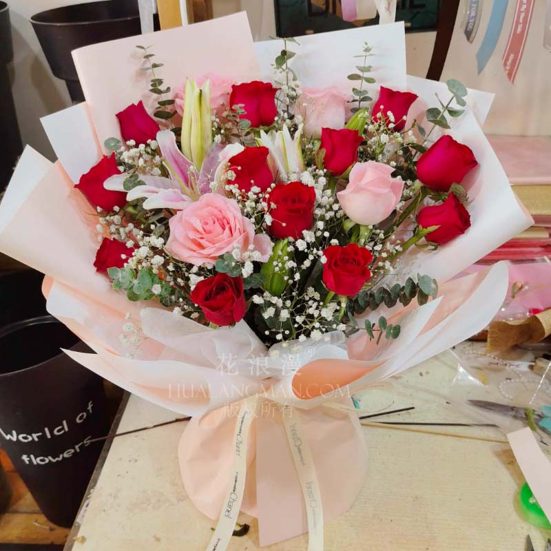 1枝多头粉百合,16枝玫瑰(12枝红玫瑰加4枝粉玫瑰),满天星,尤加利;如图包装